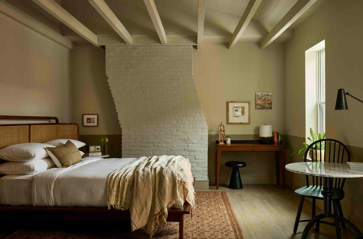 Bedrooms, which range from studios to spacious one-bedroom suites, pay respect to the building’s character while infusing a contemporary sensibility. The character of original ceiling beams mingles with bespoke furnishings, curated antiques, and small-batch accents. A muted palette with punches of rich color pulls it all together. Niceties like Printfresh robes are an extra special touch.
